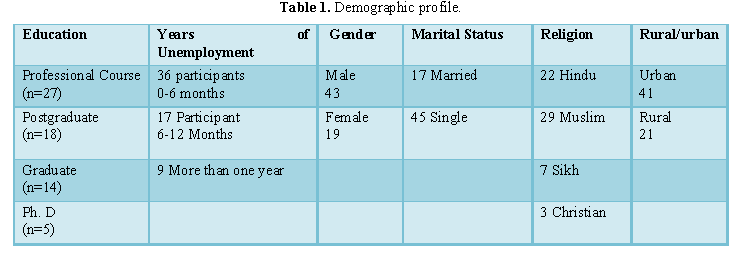Table 1 reveals that twenty-seven participants have completed professional courses, eighteen post-graduation, fourteen graduation and five Ph. D degree. In the total sample, thirty-six participants were unemployed for six months, seventeen participants six months to twelve months and nine participants were unemployed for more than one year. There were forty-three male and nineteen females. There were seventeen married participants and forty-five single. In terms of religion, twenty-two were Hindus, twenty-nine Muslims, seven Sikh and three Christians. Forty-one participants were from urban area and twenty-one were from rural areas.