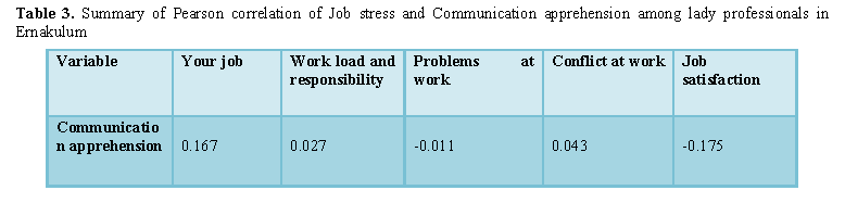 - There will be significant relationship between job stress and communication apprehension among lady professionals in Ernakulum.