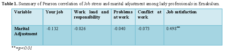 - There will be significant relationship between job stress and marital adjustment among lady professionals in Ernakulum.