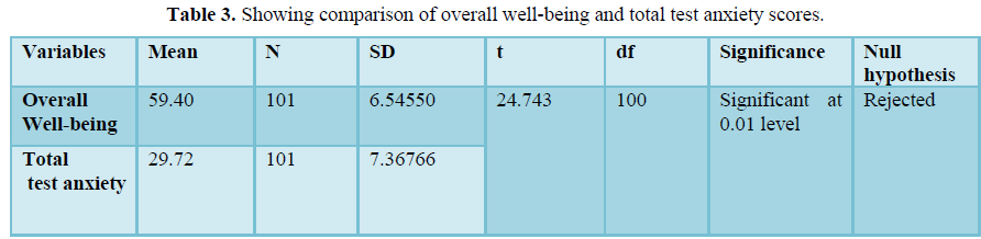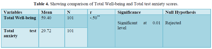 Table 4 reveals that the coefficient of correlation between overall well-being and total test anxiety is significantly negative (r = -0.5<.01). Hence, the null hypotheses stating that there will be no significant relationship between total well-being and total test anxiety in an employment interview among job applicants was rejected.