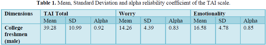 For the present study, Test Anxiety Inventory (TAI) developed by scientists [1] consisting of twenty items divided into two subscales viz. Emotionality (E) and Worry (W) in which Subjects responded on a four-point scale with response alternatives; ’almost never’,’ sometimes’,’ often’ and ‘almost always’ was used. All the twenty items were used to determine the total anxiety score after which the raw scores were converted into percentile ranks for all the three dimensions. The mean, standard deviation and alpha reliability coefficient of the TAI scale and Worry and Emotionality sub-scales are as Table 1 for college freshmen.