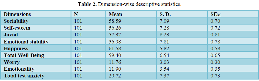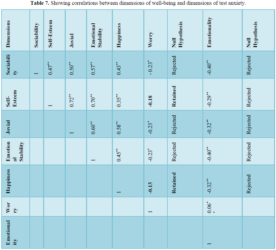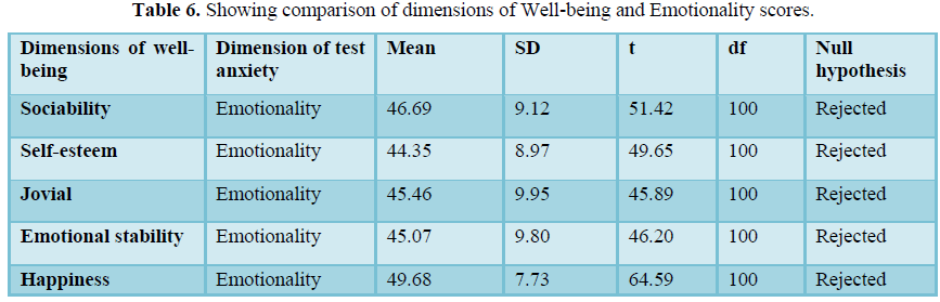- There will be no significant relationship between sociability, self-esteem, emotional stability, Jovial and happiness dimensions of well-being and emotionality dimension of test anxiety.