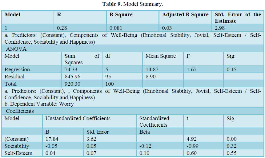 Table 9 reveals that 8% variation in the worry dimension of test anxiety (dependent variable) was explained by the components of well-being (independent variable). The F=1.67; p>0.05, indicates that independent variables jointly explained variations in the dependent variable was not significant.