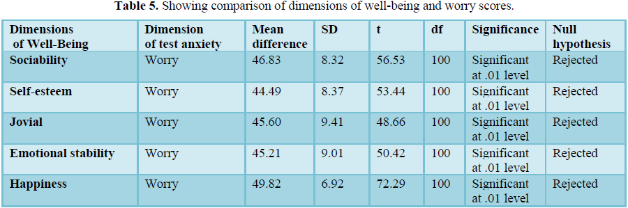 Table 5 reveals that on average, there was significant difference between all the dimensions of well-being and worry dimension of test anxiety among job applicants (p<0.01). Hence, all the null hypotheses stating \ that there will be no significant difference between dimensions of well-being and worry dimension of test anxiety in an employment interview among job applicants were rejected.