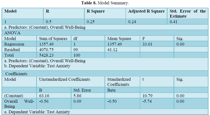 Table 8 reveals that 25% variation in the test anxiety (dependent variable) was explained by the overall well-being (independent variable). The F=33.01; p < 0.01, indicates that independent variables jointly explains variations in the dependent variable significantly.