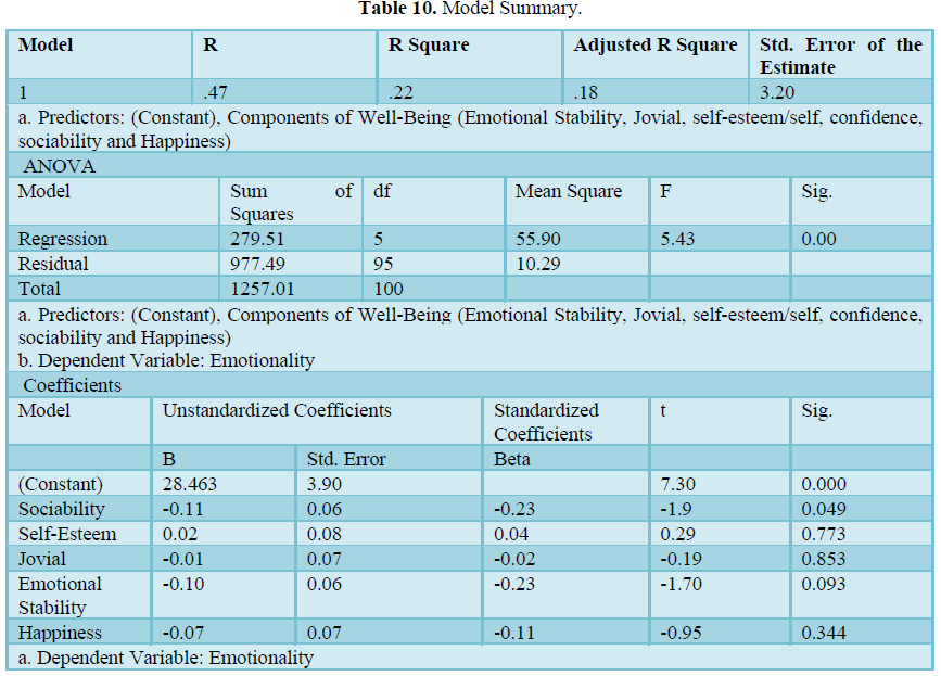 Table 10 reveals that 22.2% variation in the emotionality dimension of test anxiety (dependent variable) was explained by the components of well-being (independent variable). The F=5.43; p<0.01, indicates that independent variables jointly explains variations in the dependent variable significantly.