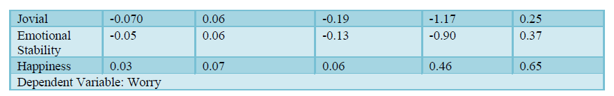 Table 7 reveals that for N=101, the correlation coefficients between sociability, self-esteem, jovial, emotional stability and happiness dimensions of well-being with worry dimension of test-anxiety yield negative correlation; the significance level of all the coefficients were small (p<0.05) except coefficient of self-esteem and happiness with worry which though negative, was not significant. Thus, all the null hypotheses stating that that there will be no relationship between sociability, self-esteem, jovial, and emotional stability dimensions of well-being with worry dimension of test-anxiety in an employment interview among job applicants were rejected. However, the relationship between self-esteem and happiness with worry were not found to be significant.