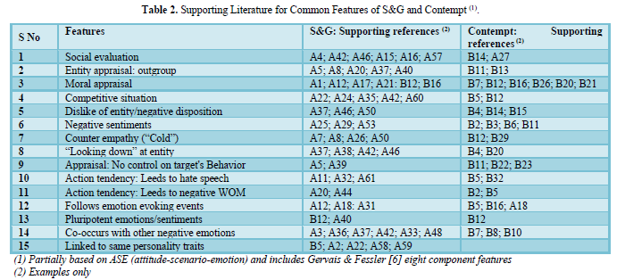 To test our proposition, we employed several commonly used and recommended qualitative mixed comparative methods [24]. We reviewed the findings regarding the antecedents and functional consequences of S&G and contempt independently, and show how they relate to each other. We use several important research contributions as references. Most of the relevant studies have focused on isolated influence of a few characteristics. Therefore, in this commentary we choose to integrate the studies and highlight results that show commonalities with contempt and S&G. Analytically, we employed a mix of Scherer and Moors [21] component differentiation procedure (Appraisal of events; action tendencies; conscious representations; and, semantic profiling). Also, the following methodologies were used: The functionalist theory of emotions and the common features approach [6,25]. Attitude-Scenario-Emotion (ASE) model that provides a useful framework to show the overlap between S&G as contempt sentiments on eight features. Wagner [16] three-prong criteria defining contempt as interpersonal, involve feeling of superiority, and view the target as negative.
