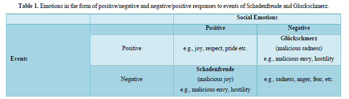 Evidently, not everyone feels happy when another person or entity is happy, nor does everyone feel sad when another is sad. Hudson [12] suggested that schadenfreude is best operationalized as how good participants felt about a negative event happening to a protagonist (Rating Task = Good, and Event Valence = Negative). Gluckschmerz how bad they feel about a positive event happening to a protagonist (Rating Task = Bad, and Event Valence = positive). Therefore, as depicted in Table 1, both Schadenfreude and Gluckschmerz are indeed atypical emotions in the form of positive/negative and negative/positive responses to events.