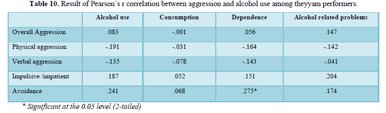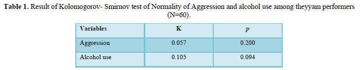 The relationship between aggression and alcohol use has been discussed by a wide range of researchers. Many of the studies found out that physical aggression and violence are more related to alcohol use in general population. That is high levels of alcohol predicted aggression among general population. The researchers also found many personality variables related to alcohol consumption, such as impulsivity and sensation seeking. Personality type of alcoholics using objective inventories shows that alcoholics have authority conflict, poor control of hostility, impulsivity, aggressiveness. Theyyam performers also consume alcohol as a part of performance. There are not many studies conducted on theyyam performers.
