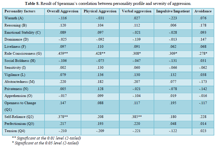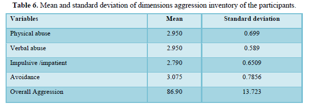 The Aggression Inventory was proposed by Glaude [87]. This 30-item instrument is designed to assess various aggressive traits. Respondents rate the items on a five-point scale, ranging from “does not apply at all to me" to "applies exactly to me.” The Aggression Inventory consists of four subscales: physical aggression, verbal aggression, impulsive/impatient, and avoidance. Because of possible gender differences in many aspects of aggression, scores on the AI must be considered separately for women and men. The reliability of Aggression Inventory has fair to good internal consistency. For men the alpha coefficient was Physical aggression = 0.82; verbal aggression =0.72; impulsive/ impatient =0.76 and 0.76 for avoidance. Validity of the Aggression Inventory subscale has been supported by men and women. The Cronbach’s alpha for Aggression inventory when administered to the present sample was found to be 0.807.