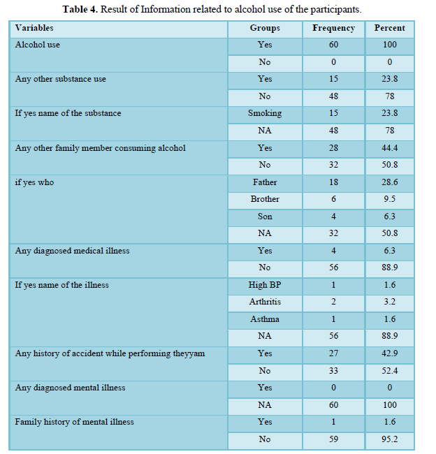 The role of alcohol use in theyyam shows that, there is high chances for becoming alcohol addicts because of the strain they have during each performance. In the season time, every performer has 10 to 11 Theyyam performance. For each performance they are spending 24-48 hrs. So, this strain and pressure may lead to increase use of alcohol. There are lot of studies which shows the link between personality factors and alcohol misuse. Personality factors like anxiety and introversion are high among alcoholic men [17].
