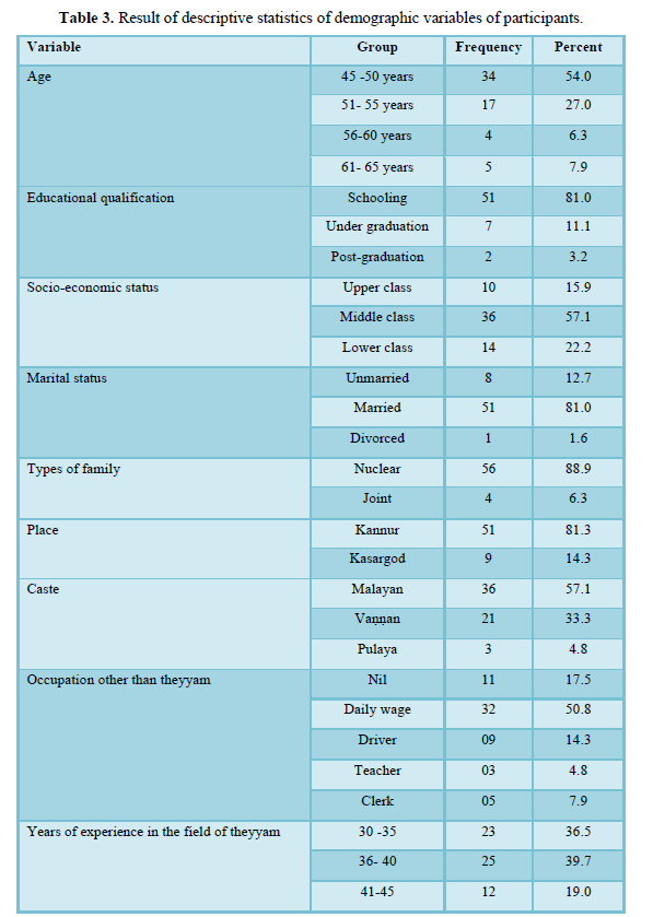 Snowball sampling is used to collect data for the study. Snowball sampling is a technique of a building list or a sample of special population by using an initial set of its members as informants. The sample size is 60 (Mean age of the participants =50.72). The sample include Theyyam performers from both Kannur and Kasargod districts where theyyam is more profoundly seen. The sample is selected on the basis of inclusion-exclusion criteria.