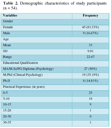 The ethical considerations were reviewed. Informed consent was sought from the participants before recruiting them for the study. Using purposive sampling technique, data was collected between September 2018 and November 2018. In all, 92 professionals (clinical psychologists and counsellors) volunteered to participate. There was missing data for 38 participants. The final sample constituted 54 professionals comprising clinical psychologists and counsellors. The participants’ mean age was 33 years with standard deviation of 9.01. Of the 54 respondents, 45 were female (83.33%). The practical experience of the professionals ranged from 2 years to 32 years.