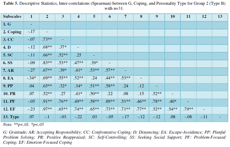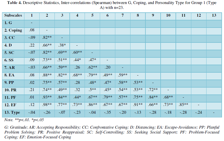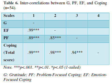 A significantly high positive correlation was found between G (disposition towards gratitude) and Coping (r = .99, p< .001; Table 6) in the total sample, substantiating Hypothesis 7.