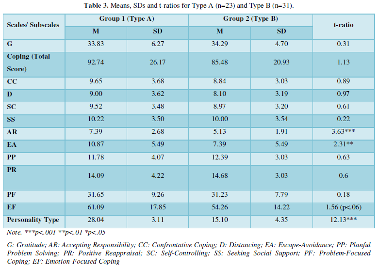 In summary, unsurprisingly no significant difference was found between Type A and Type B psychologists and counsellors concerning coping strategies, indicating that personality type may not influence their use of coping strategies in this unique sample. Personality type, however, may influence more frequent use of a particular type of coping strategy. For example, Type A individuals were found to use AR, EA, and EF coping strategies more than Type B individuals. This lack of difference can be linked with the positive effect of participants’ clinical training and practical experience. Positive reappraisal and planful problem-solving were also used more on an average by both Type A and Type B individuals. Maximum participants (96.29%) were high on gratitude irrespective of their personality type. Despite this, no significant association was found between type A and gratitude, and type B and gratitude. This suggests that personality type may not be associated with gratitude among psychotherapists. Also, a strong correlation was found between gratitude and coping in this sample.