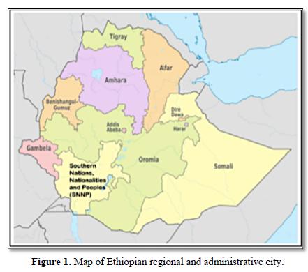 Ethiopia is found in the Horn of Africa and located between 33°E and 48°E longitudes and 3°N and 15°N of the equator. Ethiopia is a country with a great geographical variation. Its topography ranging from 4550 m above sea level to 110 m below and bordered by five countries: On the north and northeast by Eritrea, on the east by Djibouti and Somalia, on the south by Kenya and on the west and southwest by Sudan. Ethiopia is a Federal Democratic Republic composed of nine National Regional States namely: Tigray, Afar, Amhara, Oromia, Somali, Benshangul-Gumuz, Southern Nations, Nationalities and Peoples (SNNP), Gambella and Harari, plus two Administrative States (Addis Ababa and Dire Dawa City Administration) as indicated in Figure 1. The national regional states as well as the two city administrative councils are further divided in eight hundred woredas and around 15,000 Kebeles (5000 Urban and 10,000 Rural) [15].