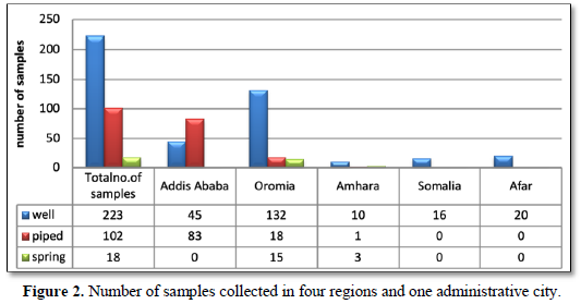In this retrospective study, 343 water samples data were used and tested in Environmental Public Health Chemistry Laboratory at Ethiopian Public Health Institute from April, 2017 to November, 2019. The samples data were collected from Amhara, Oromia, Somalia and Afar regions and Addis Ababa administrative city of the country and were classified based on the source type as spring, well, and piped water. This study used 223 well, 18 springs and 102 piped water samples collected across the country (Figure 2). The tested physicochemical parameters are sodium (Na+) and potassium (K+) were investigated.