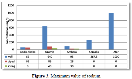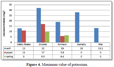 A very high sodium and potassium concentration in spring water sources are 40 mg/Land 9.9mg/l, in piped water sources, 89mg/l and 17mg/l from Oromia and well water sources, 1000 mg/L from Afar and 32 mg/l from Oromia respectively (Figures 3 and 4). In generally, all average concentration of sodium was found below 200mg/l in all regions and water type sources except Afar region in well water type source, whereas, all average concentration of potassium was found above 1.5 mg/l of drinking water standard of Ethiopia in all regions and water type sources.