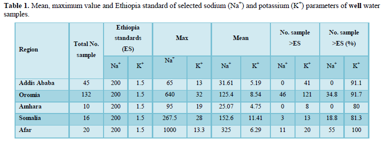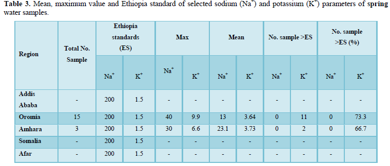 To summarize the results for sodium and potassium parameters from spring, well, and piped water samples are shown in Tables 1, 2 and 3 as mean, maximum, the mean value of sodium and potassium parameter compared with the values and % of number of sample that greater than the standards that set by the Ethiopian drinking water standards.