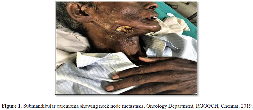 Figure 1 captures the Submandibular carcinoma in oncology ward of Rajiv Gandhi Government General College and Hospital, Chennai, 2019.