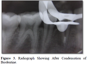 After administering local anesthesia, rubber isolation was made. The access cavity was prepared with the help of Endo access and Endo Z bur. After creating straight line access, the working length was measured with the help of conventional radiograph by using 80 no k file. After confirming the working length, cleaning and shaping of the cavity was done by 80 no k file in a circumferential manner. The canal was irrigated with 2.5 % NAOCL and final irrigation was done with normal saline. Then calcium hydroxide medicament dressing was done. After 2 weeks patient was recalled and cavity is irrigated with NAOCL and normal saline. The canals were dried with paper points. After drying the canal Biodentine was mixed according to the manufacturer’s instructions and condensed into the canal carefully with the help of plugger until it creates 5 mm of apical plug. The remaining canal space is obturated with gutta-percha. Finally, the cavity is restored with composite restoration (Figures 1-5).