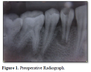 A 20-year-old young female patient presented with a chief complaint of pain in the lower right back tooth region for past 1 month. Previous history revealed that he had a trauma at his 9 years of age. His medical history was non-contributory. Intraoral examination revealed discoloration of crown and grade 1 mobility, with already access opening was attempted by general dentist and referred to our department for specialty treatment in relation to 45. The tooth showed tender to percussion. Tooth mobility and probing depth was within their normal physiologic limit. Thermal and electric pulp test elicits negative response in 45. Radiographic examination revealed fracture of enamel and dentin associated with periapical lesion around the immature root apex of 45. Based on clinical and radiographic analysis, provisional diagnosis was made as pulp necrosis with symptomatic apical periodontitis and apexification treatment was decided.