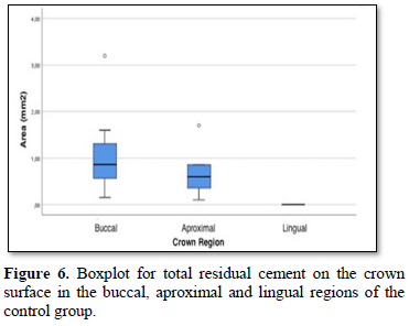 In the control group, when compared to 3 regions of the crown-abutmentcomplex (buccal, aproximal and lingual) in terms of the surface area covered by residual cement on the crown surface; it was determined that the buccal side of the crown was 1,05 (±0,88) mm2 on average, the aproximal side was 0,64 (±0,45) mm2 and the lingual side was 0,00 (±0,00) mm2. As a result; in the control group, the surface area covered by residual cement on the crown surface in the lingual region was found to be significantly lower than the crown surface in the aproximal region (p = 0.001) and the crown surface in the buccal region (p <0.001) (Figure 6).