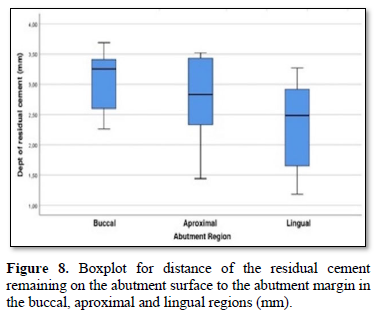 In the control group, the mean depth of residual cement on the abutment surface was calculated as 3.10 mm in the buccal region, 2.75 mm in the aproximal region and 2.37 mm in the lingual region. The depth of residual cement on the abutment surface was determined mostly on the buccal, aproximal and lingual surface, respectively. As a result; a statistically significant difference has not been detected among the regions (buccal, aproximal and lingual) in terms of the depth of residual cement left on the abutment surface (p<0.054) (Figure 8).