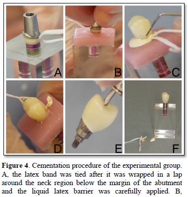Abutment which the liquid latex barrier was applied carefully placed into the model. C, After the cement was hardened the excess material was broken with a probe around the crown margin. D, the latex band was carefully removed by keeping it from the long section which was left for easy access by pulling it to the right and left and then upwards. E, Crown-abutment complex was removed from the model. F, crown-abutment complex with cement and latex residues.