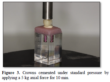 The models were divided into two groups as control (cleaning with conventional probe method) and experimental (cleaning with liquid latex barrier technique). In the experimental group, the latex band was tied after it was wrapped in a lap around the neck region below the margin of the abutment and the liquid latex barrier (BN NYE liquid latex) was carefully applied to the metal surface at the bottom of the step margin of the abutment by brush and left to dry completely (Figure 2). The abutments were carefully placed in the model and were torqued to 30 Ncm on the analogs. Screw head of the abutment was completely closed with teflon tape before the cementation process. The surface of the temporary crown below the gingiva was isolated with vaseline to prevent adhesion of the cement. In this study, zinc polycarboxylate cement (Poly-F® Plus / BondexTM, DENTSPLY DeTrey GmbH) which is the permanent cement for cementation process was used and the cement was prepared according to the manufacturer’s instructions. The crowns were completely filled with the material and cemented under finger pressure by a single practitioner (Figure 3). After the cement was hardened the excess material was broken with a probe around the crown margin. Then, the latex tape was carefully removed by keeping it from the long section which was left for easy access by pulling it to the right and left and then upwards. Figure 4 shows cementation procedure of the experimental group. In the control group, the crowns were completely filled with cement and adhered under the same standard pressure as the experimental group. After the cementation procedure for the hardened material, the cleaning operation was carried out carefully by using only a conventional probe without damaging the artificial gingiva. After this procedure, temporary crowns were accessed to screw entry by means of a hole drilled with a diamond rond drill in the predetermined occlusal access points and teflon was removed and the screw of the abutment was removed together with the abutment by reverse torque.