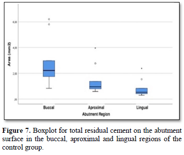 In the control group, when compared to 3 regions of the crown-abutment complex (buccal, aproximal and lingual) in terms of the surface area covered by residual cement on the abutment surface; it was determined that the buccal side of the abutment was 2,80 (±1,82) mm2 on average, proximal side was 1,43 (±1,08) mm2 and lingual side was 0,81 (±0,66) mm2. As a result; in the control group, the surface area covered by residual cement on the abutment surface in the lingual region was found to be significantly lower than the abutment surface in the buccal region (p = 0.001) (Figure 7).