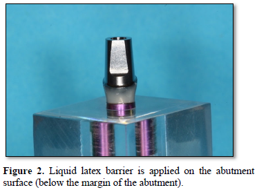 Purpose: After cementing of implant-supported cement-retained restorations, the complete removal of the cement is a serious problem. This article describes a new technique in vitro condition where liquid latex barrier is applied around the implant abutment before seating to prevent the adhesion of cement to the subgingival of the abutment.
