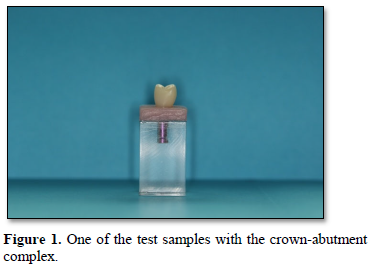 The 20 implant analogs (Bego Implant Systems GmbH, Bremen/ Germany) were placed into acrylic blocks in such a way that directions and three-dimensional positions of the analogs (bukkolingual, cervicoinsizal and mesiodistal) would be the same. İn order to simulate the gingiva a silicone gingival mask (Zermack Gingifast Elastic, Badia Polesine/ Italy) was applied. On the other hand, onto the transparent acrylic model UFI gel P (VOCO GmbH, Cuxhaven, Germany) adhesive was applied to connect the silicone gingival material. Thus, a flat silicone gingival surface was formed in such a way that the height of the anatomic titanium abutments (SUB-TEC Plus Ti-Pfosten gingiva height 2.5-4mm, Bego Implant Systems GmbH, Bremen/ Germany) which were used would be equal to the gingival height (4 mm) of the lingual aspect. They were scanned by digital measuring device (3 Shape D810, Copenhagen, Denmark) and the data was transferred to the computer environment. The restoration was designed in the form of upper first premolar teeth by using CAD software (3 Shape Dental Designer, 3 Shape A/S, Copenhagen, Denmark). A total of 20 polymethyl methacrylate (PMMA) temporary crowns were produced by using PMMA block (Dental PMMA, Tian Shwu Co., LTD./Taiwan) as a material by five-dimensional CAM unit (CORİTEC 350i, imes-icore GmbH). Figure 1 shows one of the test samples.
