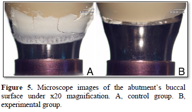 Crown-abutment complexes were examined under light microscope (SZ61/SZ51 Zoom Stereo Microscopes/DP12 Microscope Digital Camera System, OLYMPUS). For each model, digital images were taken from 4 regions (mesial, distal, buccal, lingual) under x20 magnification. Figure 5, shows microscope image of the abutment’s buccal surface under x20 magnification of control and experimental group. Recorded images were transferred to the computer environment and linear and field measurements were performed in ImageJ program (ImageJ and NIH Image Software; National Institute of Health, Bethesda, Md). Then, the following parameters were measured: The surface area covered by residual cement on the crown surface below the gingival level (area; mm2), the surface area covered by residual cement on the abutment surface below the gingiva level (area; mm2) and distance from the residual cement left uncleaned at the most apical part of the abutment to the level of the abutment margin (Depth; mm).