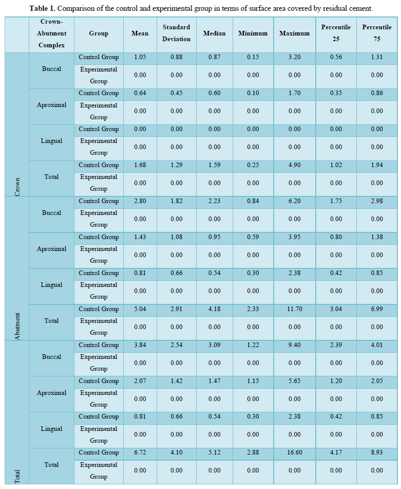 In the experimental group, no residual cement was observed in any part of the crown-abutment complexes. In the control group, the total surface area covered by residual cement below the gingiva is 6,72 (±4,10) mm2. As a result; a statistically significant difference is observed between the control and experimental group in terms of total surface area covered by residual cement below the gingiva (p<0.001) (Table 1).