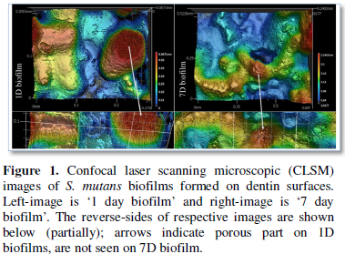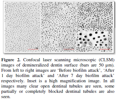 Root dentin surface images are shown in Figure 2. The surface was remarkably smooth with open dentinal tubules - open tubule size was very small as obvious in the dentin before biofilm attack (left). After 1D biofilm attack the surface became rougher and tubular orifice became wider which are easily detectable on the image (middle). As biofilm attack continued for 7 days the surface roughened further and tubular orifice widened remarkably as demineralization continued (right). Some notable information with 3D color gradation of the biofilm and dentin demineralization was acquired with this VK-X series of CLSM. The VK-X achieves high-resolution sensing by using a 16-bit photomultiplier as its laser receiving element. Also, it is capable of nanoscale measurements, even from a distance. The non-contact profilometeric image of the unstained biofilm could be taken in less than a minute unlike other biofilm imaging reported so far [11]. Therefore, biofilm maturation can be monitored at any stage without disturbing their growth. Also, the same biofilm specimen can be analyzed using any other method as the partially air dried biofilm remains unharmed. Identification of porous areas was possible due to the penetration and return of CLSM laser through premature or loosely condensed matrix of the biofilms and that would help in determining the time of application of antibacterial agents during in vitro studies. Clear images of normal dentin and demineralized dentin are also helpful for many in vitro experiments; e.g. testing degree of demineralization and remineralization of dental hard tissues [12].