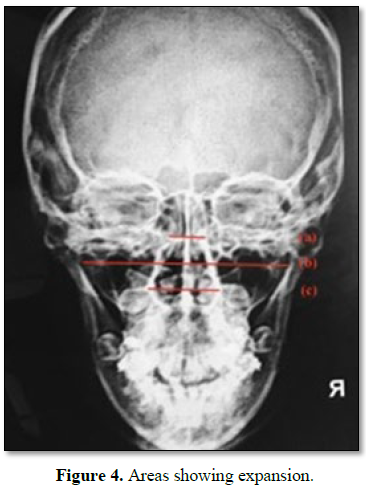 Post expansion transverse measurements of frontonasal area, zygomatic arch and nasal cavity should be recorded and compared to the pre-treatment values to evaluate and compare the skeletal changes. Maximum expansion is usually seen in the nasal cavity [30] followed by zygomatic arch and frontonasal area (Figure 4).
