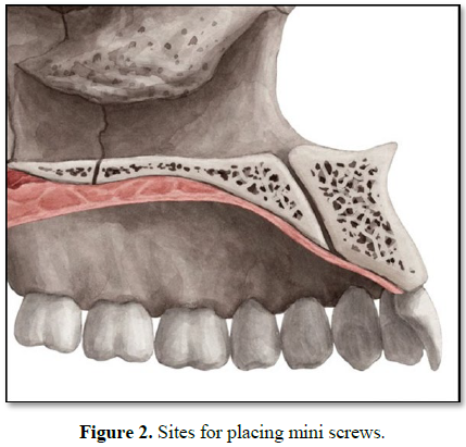 Factors like convenient access, low risk of damage to the surrounding anatomical structures [22-24], high quality cortical bone and thin mucosa confirming adequate stability [25,26] makes paramedian area (3 mm lateral to the suture in 1st premolar region) the most appropriate site for placement of mini screws [27-29] (Figure 2).