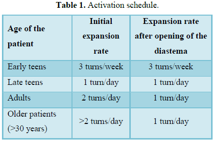 Activation initially is done for 2 turns/day till development of diastema, followed by 1 turn/day till sufficient expansion has been achieved [16]. Activation schedule was followed as described below (Table 1) [17]: