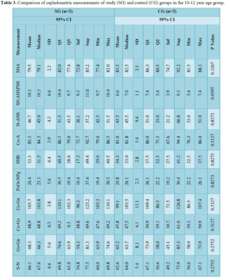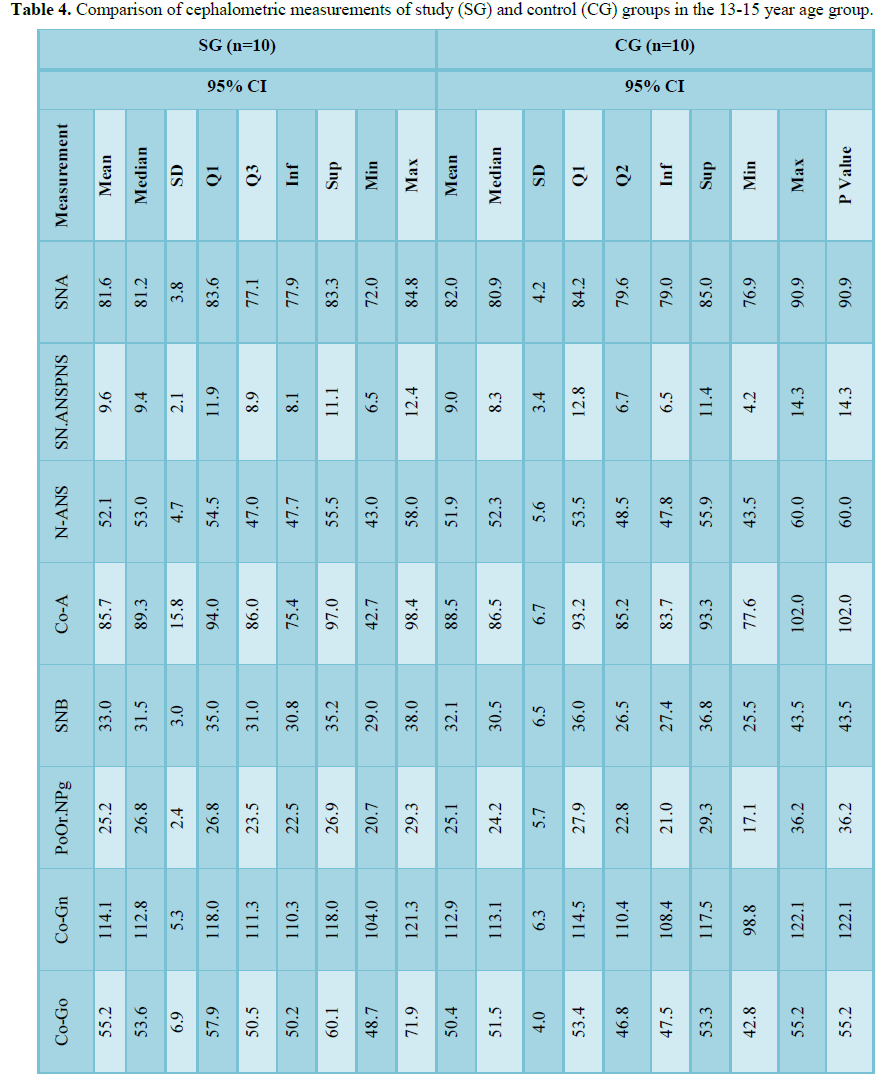 The cephalometric measurements of study and control groups were compared according to various age groups, as mentioned in Table 4.