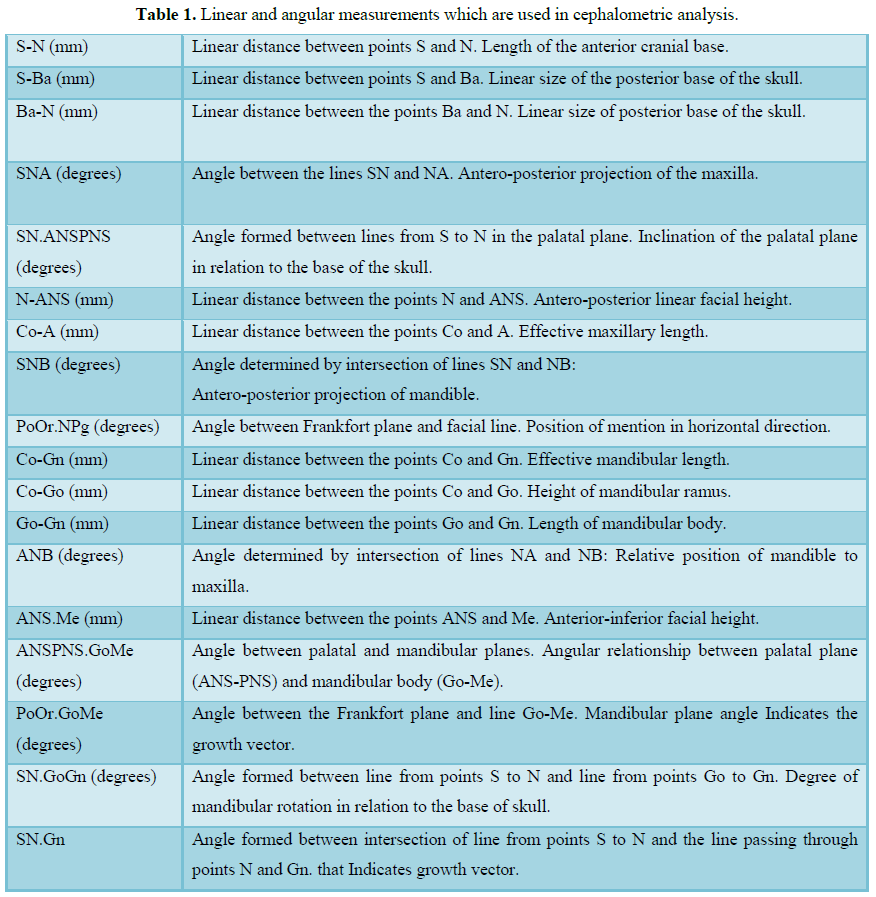The patients excluded from this study were those undergoing any long-term systemic therapy for severe chronic diseases (except AIDS in study group) who had received earlier radiotherapy, chemotherapy or any previous orthodontic as well as orthopedic treatment. The diagnostic aids for orthodontic documentation were facial photographs, panoramic radiograph, lateral teleradiograph and study models. For this study, we used only teleradiographs, on which cephalometric points of hard profile were identified and used for measuring craniofacial morphology. Cephalometric tracings of eighteen (linear and angular) measurements on teleradiographs were done by using 2 methodologies. The mean values of each measurement were compared between the two groups by age range. Overall, 14 points and 18 (linear and angular) measurements were used, all based on the previous studies by various authors [27-34] (Figure 1 and Table 1).