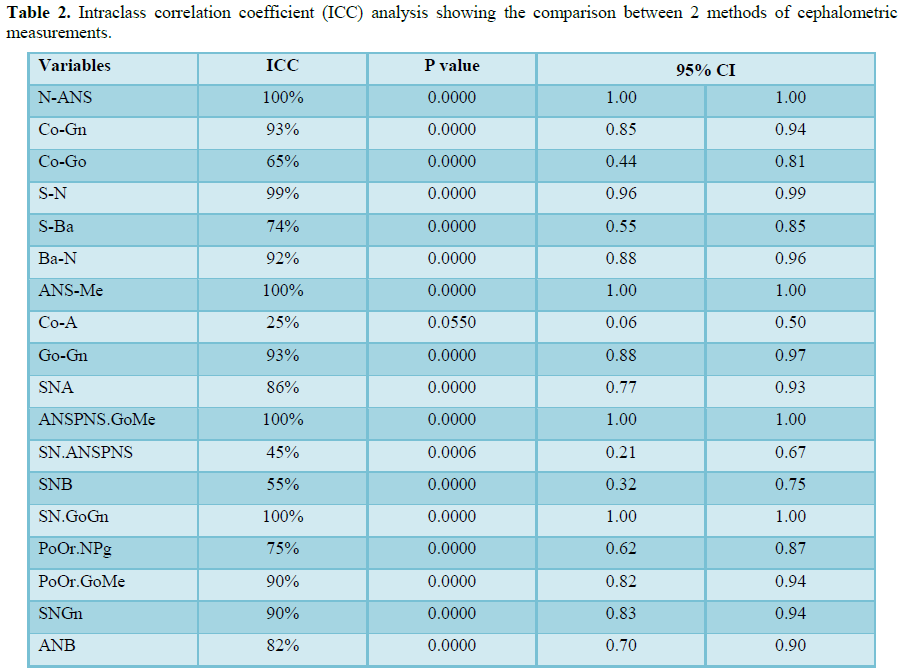 The exceptions were variables Co-A, SN.ANSPNS and SNB, which had good agreement of 60%. Nevertheless, we declared that agreement was positive for SN.ANSPNS and SNB, since P values were statistically significant (P<0.05). As for Co-A, P value was out of significance range (Table 3).
