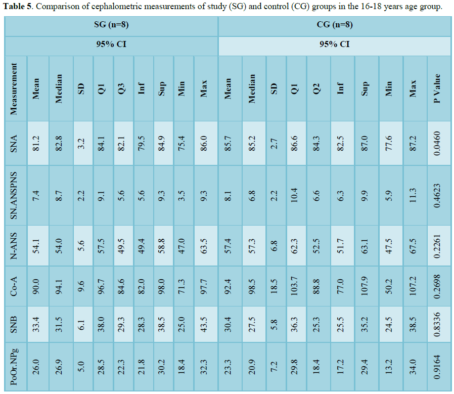 With regards to the mean values in 16-18 year age group, the position of maxilla in the study group was slightly decreased, and the mandible was protruded in relation to base of the skull when compared with the control group. Although the former had an effective maxillary size smaller than that of latter, effective mandibular size was similar between 2 groups. The growth pattern was more horizontal in the study group than in the control group. The only statistically significant difference was position of the maxilla in anteroposterior direction (SNA) (Table 5).