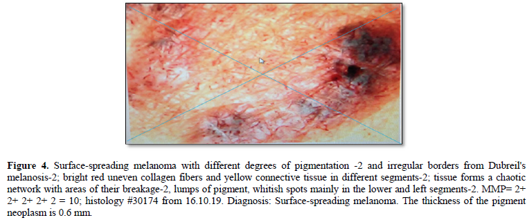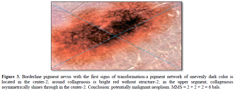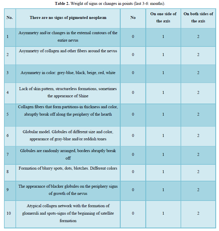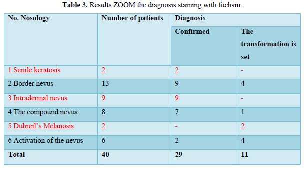 As a result of the clinical examination, it was concluded that 9 patients have intradermal nevus, 2 have senile keratosis, and 8 have mixed nevus. In 2 cases, Dubreuilmelanosis was established. 13 people have border nevi. In addition, 6 patients were suspected of activating the process (Table 2).