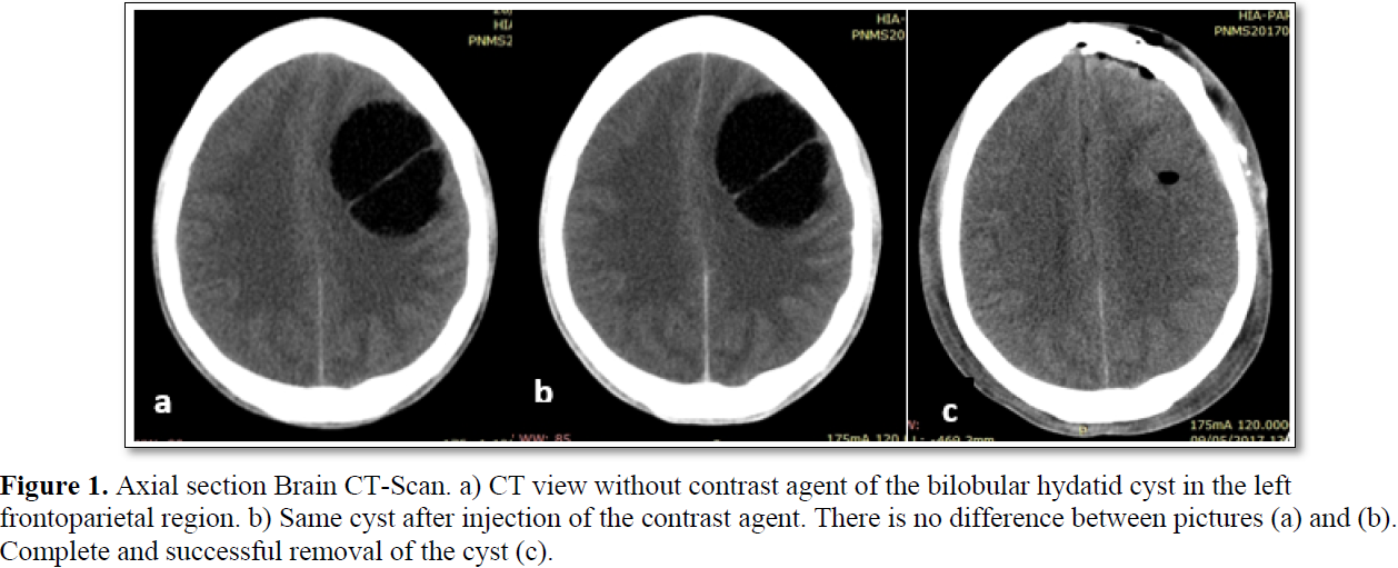 Cerebral hydatid cysts are of a particular interest and, according to studies, represent 1 to 3% of intracranial expansive processes [2,4,6]. This parasitosis, described as the cerebral parasitosis par excellence of the Mediterranean, is not known among epileptogenic disease in sub-Saharan Africa. This case revealed in Benin can be considered as an original case in West Africa. Indeed, publications concerning hydatid cerebral hydatid cyst are practically unavailable in West Africa.