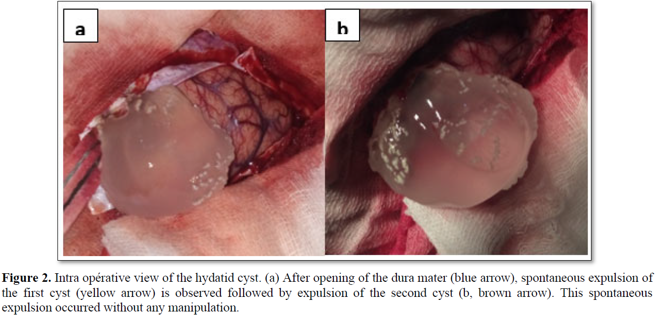 The management of hydatid cerebral hydatid cyst is surgical. Among the surgical techniques, hydro pulsion by Arana-Iniguez technique [8] or forced hydrostatic expulsion by Dowling-Orlando technique [9] are the most commonly reported techniques. After the realization of a bone flap focused on the cystic formation and an opening of the dura mater, the Arana-Iniguez technique consists of introducing a flexible probe between the cyst wall and the parenchyma and then injecting hypertonic saline into the probe. A second or even a third probe may be introduced. This results in hydro pulsion and delivery of the cyst.
