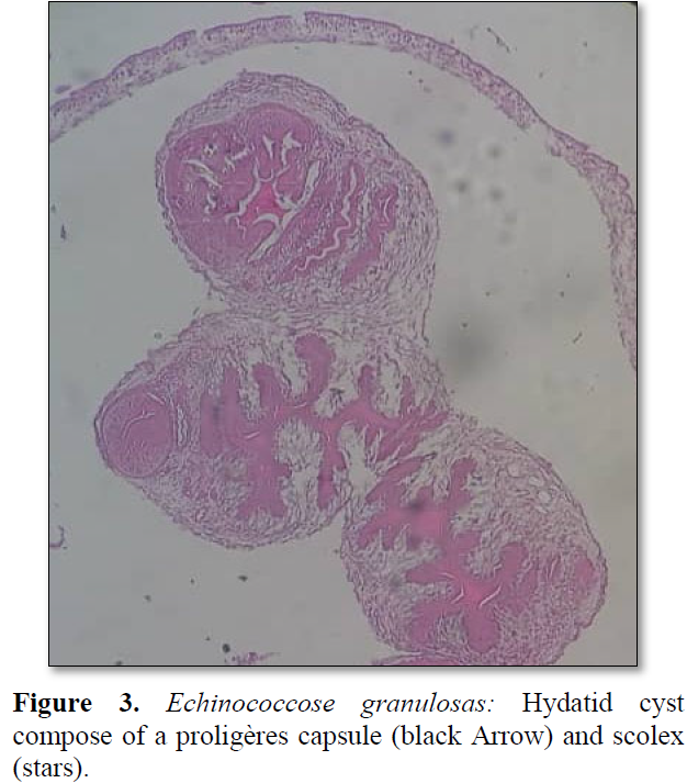 After exposure of the dura mater, a cystic formation containing a translucent collection is observed (Figure 2). Under the effect of cerebral impulses, without any manipulation, two identical fluid formations were ejected one after the other. The postoperative Outcome were simple and no post-operative complications were observed. Post-operative Brain-CT scan was satisfactory (Figure 1c). Histopathological examination of the surgical specimen (Figure 3) revealed that it was cerebral hydatidosis, based on the presence of the proligerous membrane of the cyst containing protoscolex. This surgical procedure was completed with a medical treatment. It was antiparasitic therapy (Albendazole 800mg daily in two doses) for 6 months. He was followed for a period of 12 months. Seizures and headaches disappeared. A total regression of motor deficit was reported. The patient recovered his job as a teacher and lived a normal life.