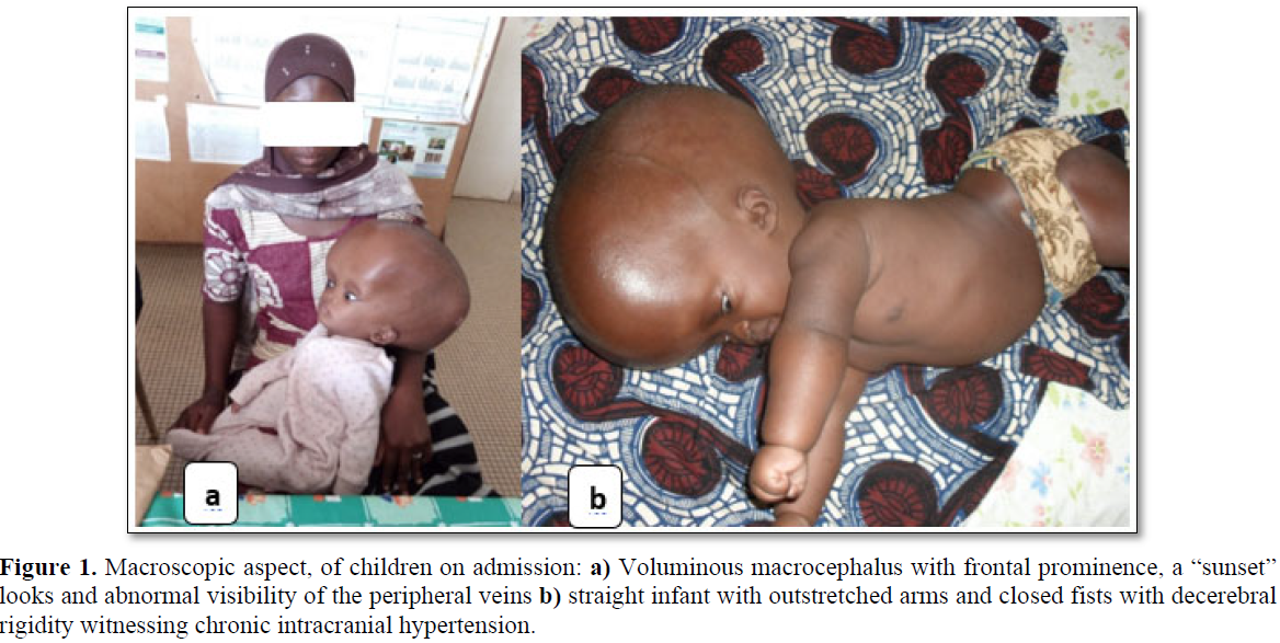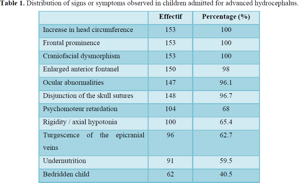 The mean age of the children was 9.37 ± 16.79 months with a extreme of 3 months and 11 years. These children were divided into 73(47.7%) boys and 80(52.3%) girls with a sex ratio of 0.9. A medical history of a recent infection or hospitalization was found in 44 (28.7%) children. Operative spinal dysraphy was found in 15 (9.8%) children. The mean head circumference observed in these children was 61±8.75 cm with ranges of 49cm and 76cm. Figure 1 shows the morphological condition of these children at admission. The main signs of examination observed in these children were reported in Table 1.