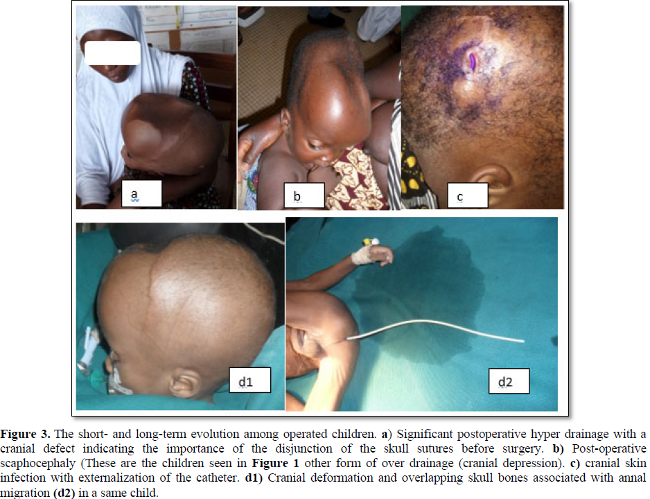 Patients & Methods: This was a retrospective and transversal study performed at the teaching hospital of Borgou in Benin. From 2018 to 2018, children admitted for hydrocephalus were registered. The cranial circumference, the condition of the cerebral parenchyma and ventricular dilation, and the psychomotor state were the major criteria used to indicate an advanced hydrocephalus. Clinical condition, postoperative evolution and child outcomes were the variables studied. The follow-up was 1 to 10 years.